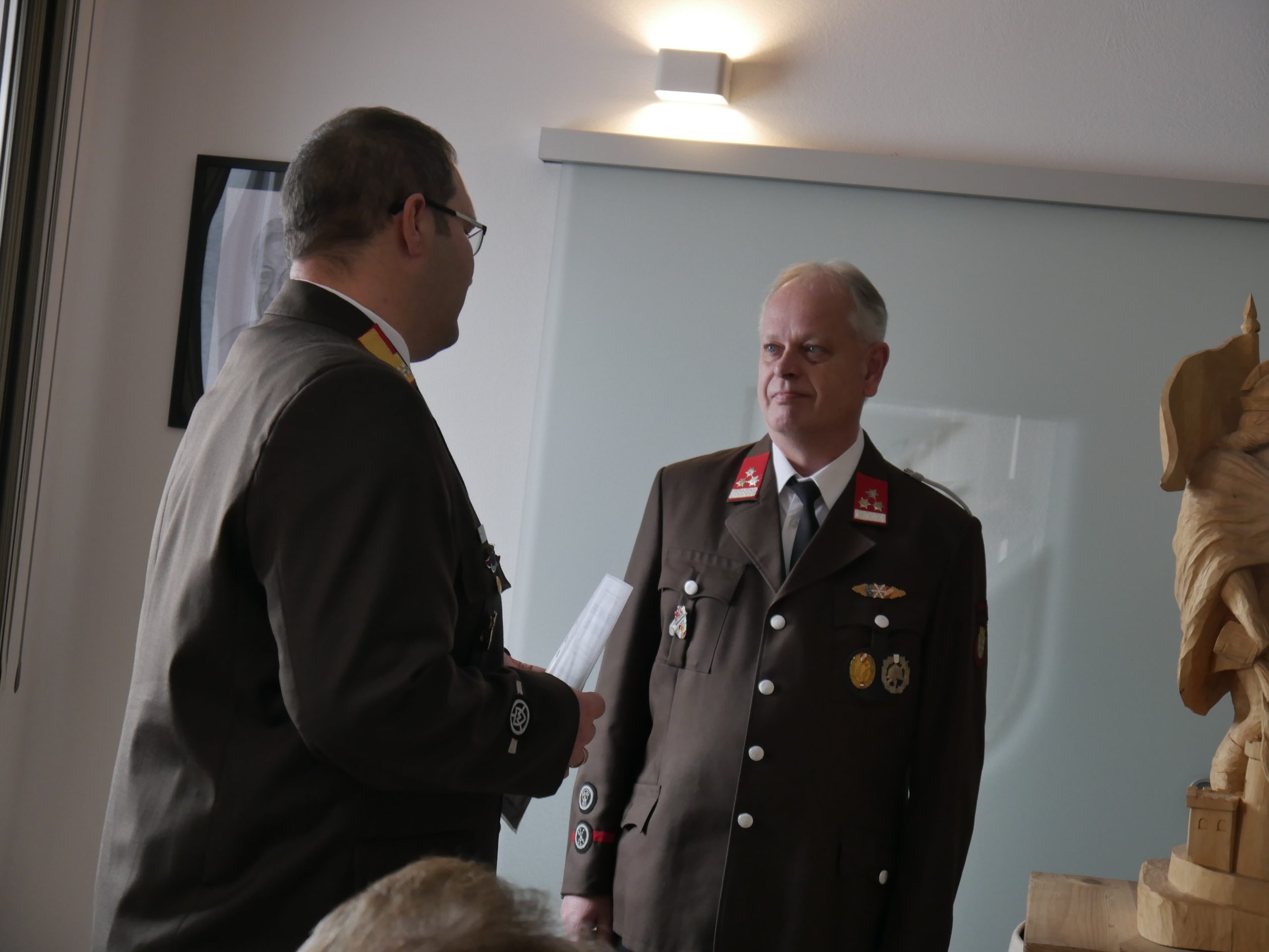Als weiterer Tagesordnungspunkt folgten Angelobungen, Beförderungen und Ernennungen. Reinhard Gatterer legte nach 25 Jahren seine Funktion als Sachbearbeiter Nachrichtendienst zurück und wurde in Würdigung seiner langjährigen Verdienste zum Ehrenhauptlöschmeister befördert. Ihm folgte Sebastian Hagmann, der in diesem Zuge zum Sachbearbeiter befördert wurde.